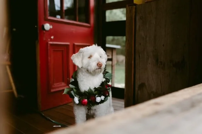 A white dog wearing a holiday wreath standing on a wooden porch in front of an open red door.
