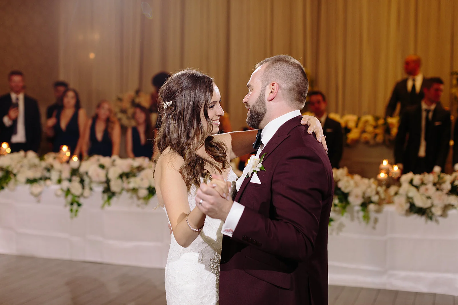 Bride and groom dancing at a wedding reception with guests watching in a decorated ballroom.